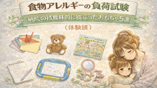 食物アレルギーの負荷試験で長い待機時間をどう過ごす?1歳から通院していたわが家が実際に持っていってよかったおもちゃ5選を紹介します。病院で静かに遊べる絵本やお絵描きボード、ヘアアクセサリーなど体験談をまとめました。